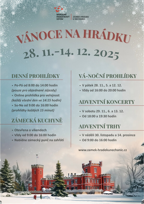 Dovolujeme si Vás pozvat na 31. ročník akce Vánoce na Hrádku u Nechanic. Od 28. listopadu do 14. prosince 2025 Vás ve vánočně vyzdobených interiérech seznámíme s historií Vánoc, jejich zvyky a tradicemi.