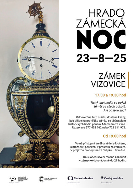 Běžný návštěvník by si možná ani nevšiml, ale plně vybavené interiéry vizovického zámku jsou téměř v každé místnosti doplněny i historickými hodinami. A my jsme pro letošní ročník Hradozámecké noci oslovili sběratele historických hodin, pana Adamce ze Zlína, aby právě na toto téma přichystal prohlídku.