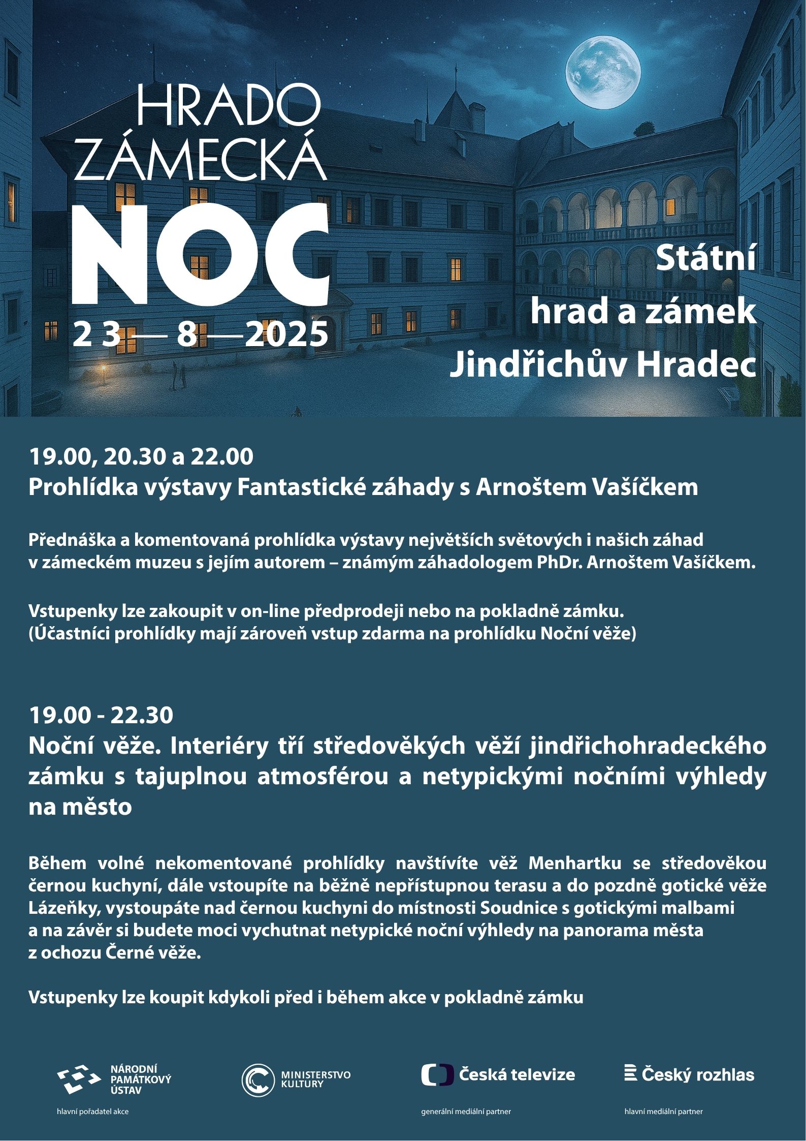 V rámci Hradozámecké noci na jindřichohradeckém zámku bude sám Arnošt Vašíček průvodcem po svých sbírkách. Komentované prohlídky výstavy s Arnoštem Vašíčkem začínají v 19:00, 20:30 a 22:00. Prohlídky budou trvat přibližně 60 minut. (Dnes, 23. 8., jsou již vstupenky vyprodané...)